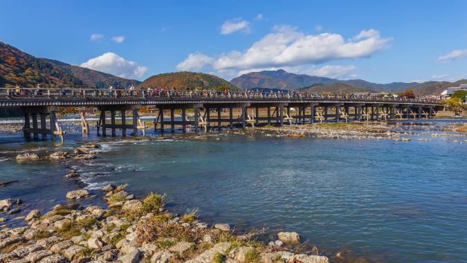 嵯峨野和嵐山地區位於京都西部,是京都第二大熱門觀光區。八世紀時的貴族經常來到這裡,在稻田和竹林間欣賞五彩斑斕的樹葉或划船作樂。此地著名景點「渡月橋」橫跨嵐山腳下的保津川。橋的外觀仍保留 17 世紀的模樣。
